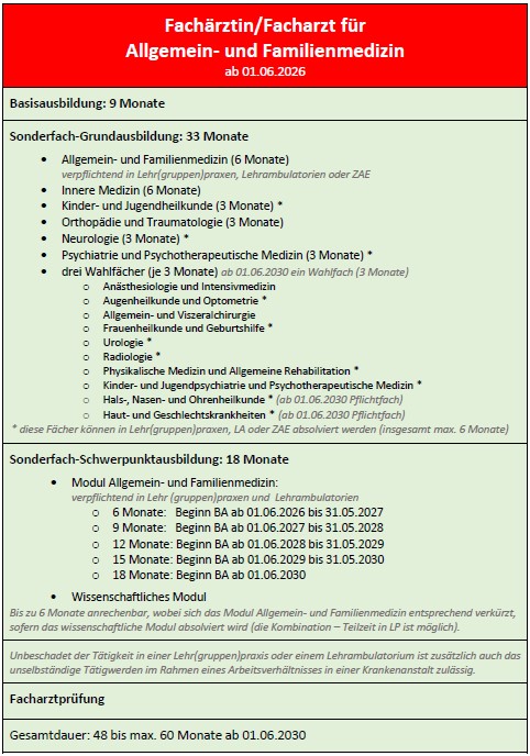 Die Ausbildung zur Fachärztin/zum Facharzt für Allgemein- und Familienmedizin wird nach dieser Übergangsperiode ab dem 1. Juni 2030 schlussendlich insgesamt fünf Jahre dauern.