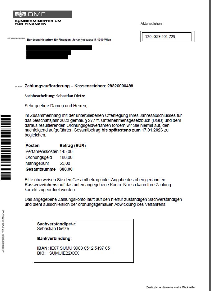 Kolleginnen und Kollegen haben uns darauf aufmerksam gemacht, dass derzeit per Mail vermeintliche Bescheide im Namen des Bundesministeriums für Finanzen (Beispiel siehe Anhang) zugesendet werden, welche eine Zahlungsaufforderung aufgrund einer angeblich unterbliebenen Offenlegung des Jahresabschlusses enthalten.