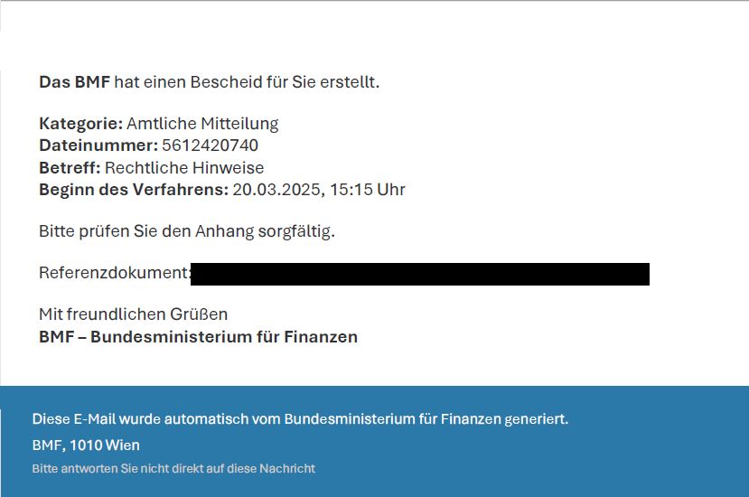 Weiters darf in diesem Zusammenhang darauf hingewiesen werden, dass Bescheide von Bundesministerien grundsätzlich nicht per Mail übermittelt werden, sondern mit Anmeldung via ID Austria über digitale Postfächer abgerufen werden können. Sollte die Benachrichtigungsfunktion (z.B. bei FinanzOnline) aktiviert sein, empfiehlt es sich trotzdem jegliche Mail auf Plausibilität (insbesondere Absender, Rechtschreibfehler sowie die optische Darstellung) zu prüfen.